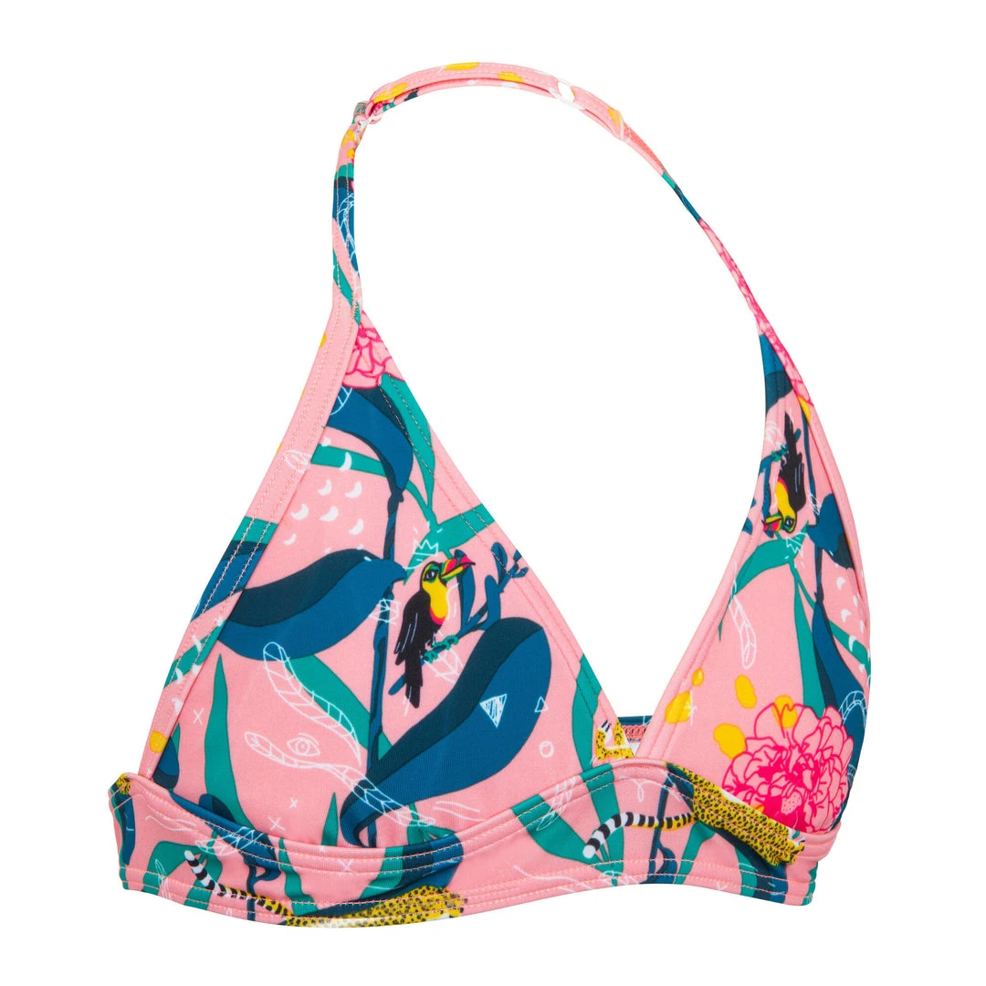 Our design team developed this swimsuit top for beginner girl surfers surfing in broken waves.