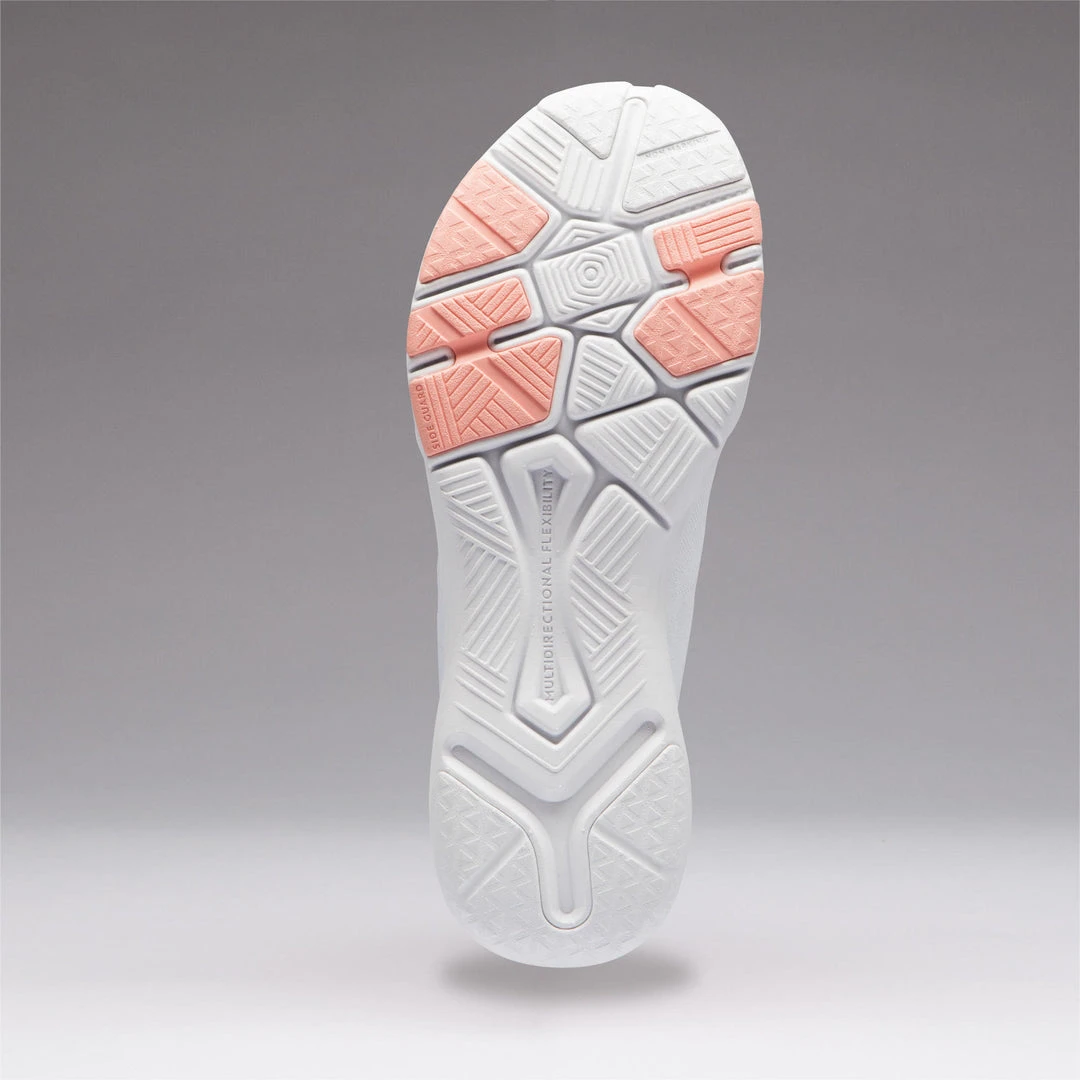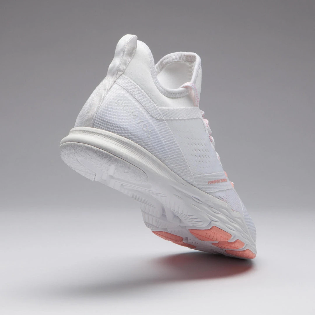 The main point of impact between the foot and the floor during fitness activities is at the forefoot, whereas for running the impact is at the heel. We design our shoes with excellent cushioning at the forefoot to protect your body from repeated impacts while also stabilizing your supporting leg to help you string movements together more smoothly.