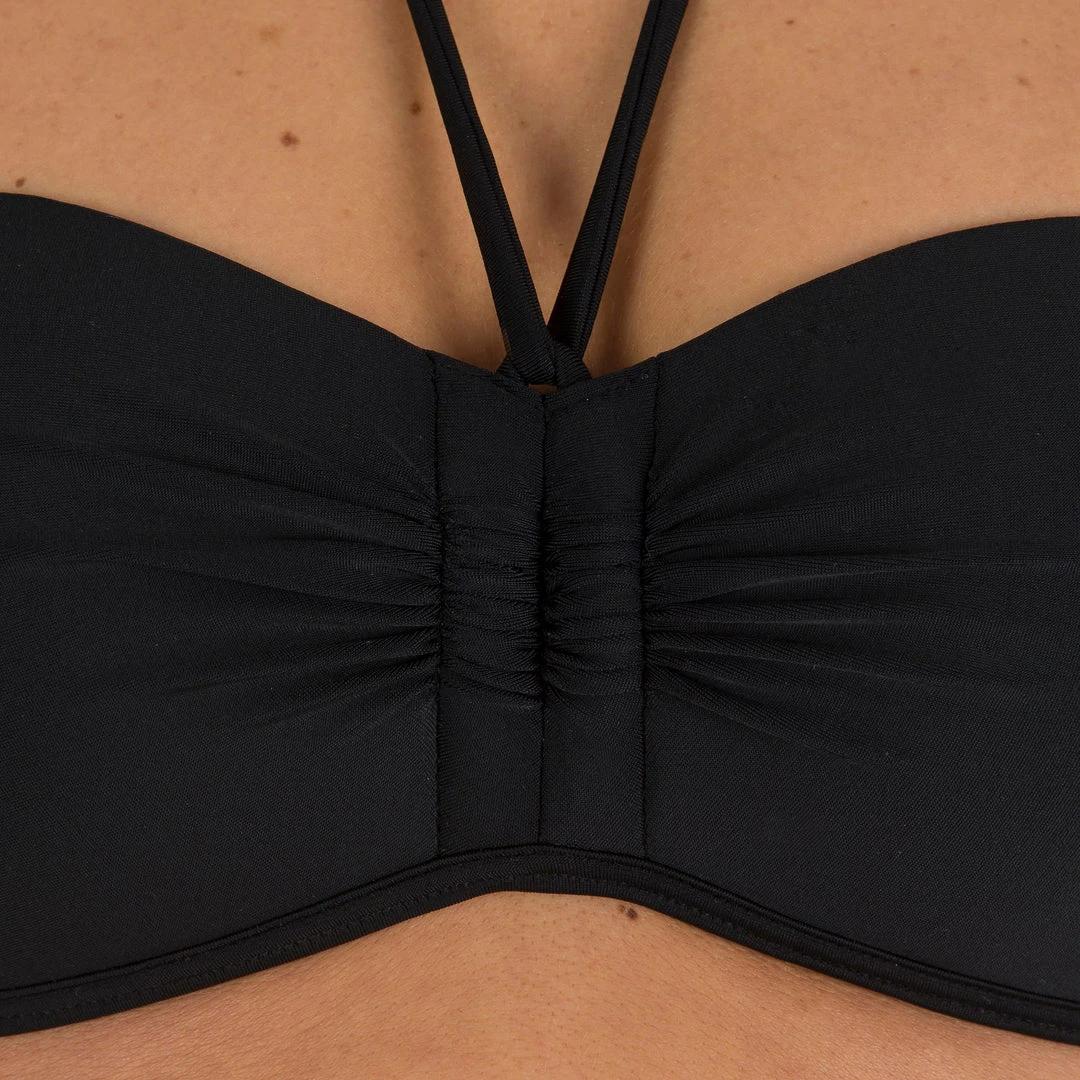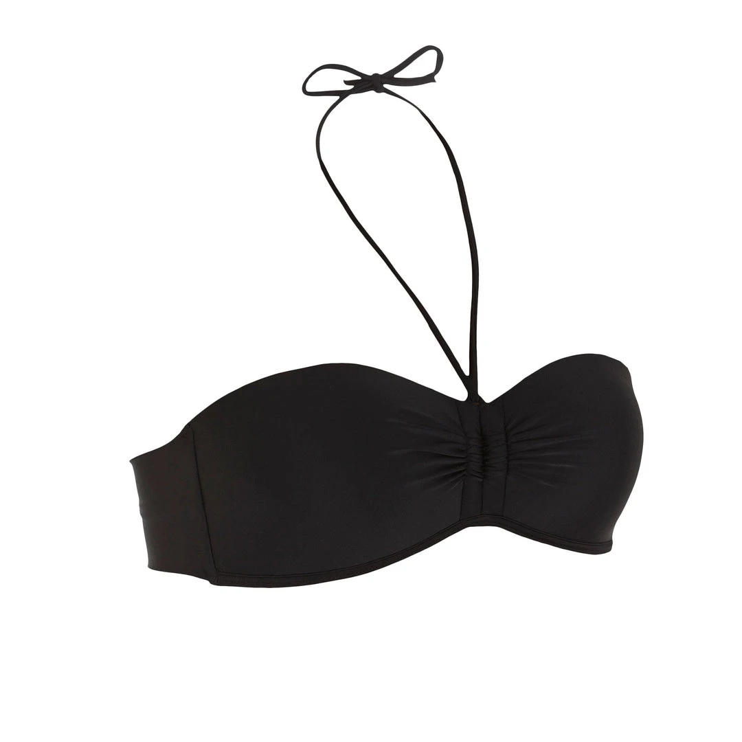 Women’s bandeau swimsuit top with removable neck tie. Free and show off your shoulders. Adjustable back and neck ties. Fixed cups and reinforced sides. Light support.