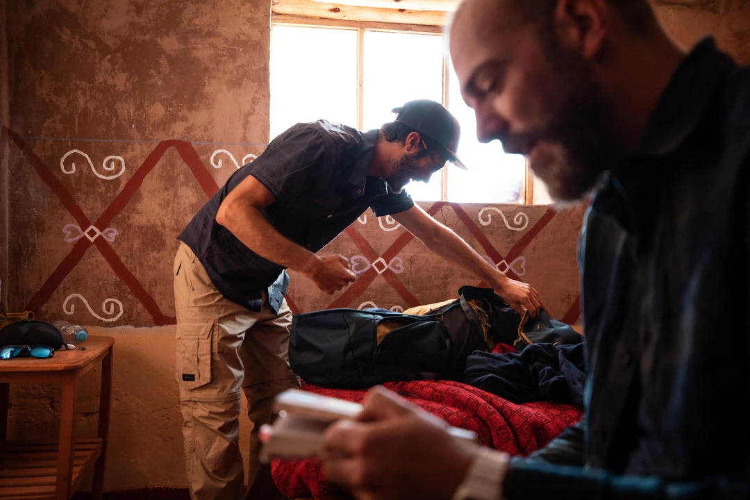 Put your bedding at the bottom. Near your back, place heavy equipment (tent, stove, food). Pack your clothes around these items. The groundsheet can be placed under the flap; the tent under the bag if there’s no space inside. Keep a waterproof jacket and fleece to hand. In the pockets, place small items for the day (sunscreen, map, glasses…). The water bag should be placed in the compartment that is usually placed the length of the back.