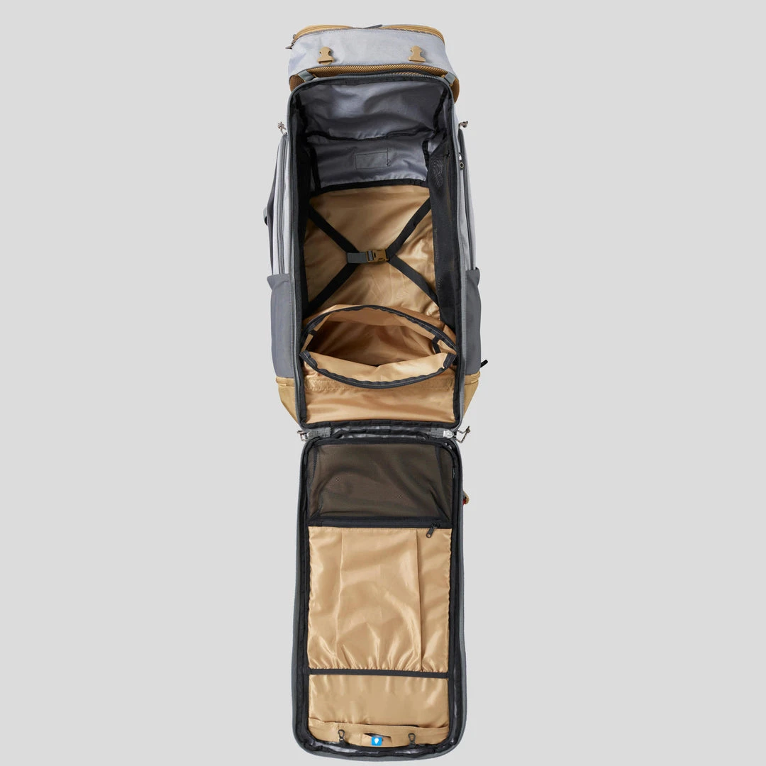 A bag designed to best meet the needs of backpackers, with large full opening on the back of the rucksack, lockable compartments and removable shoulder bag.