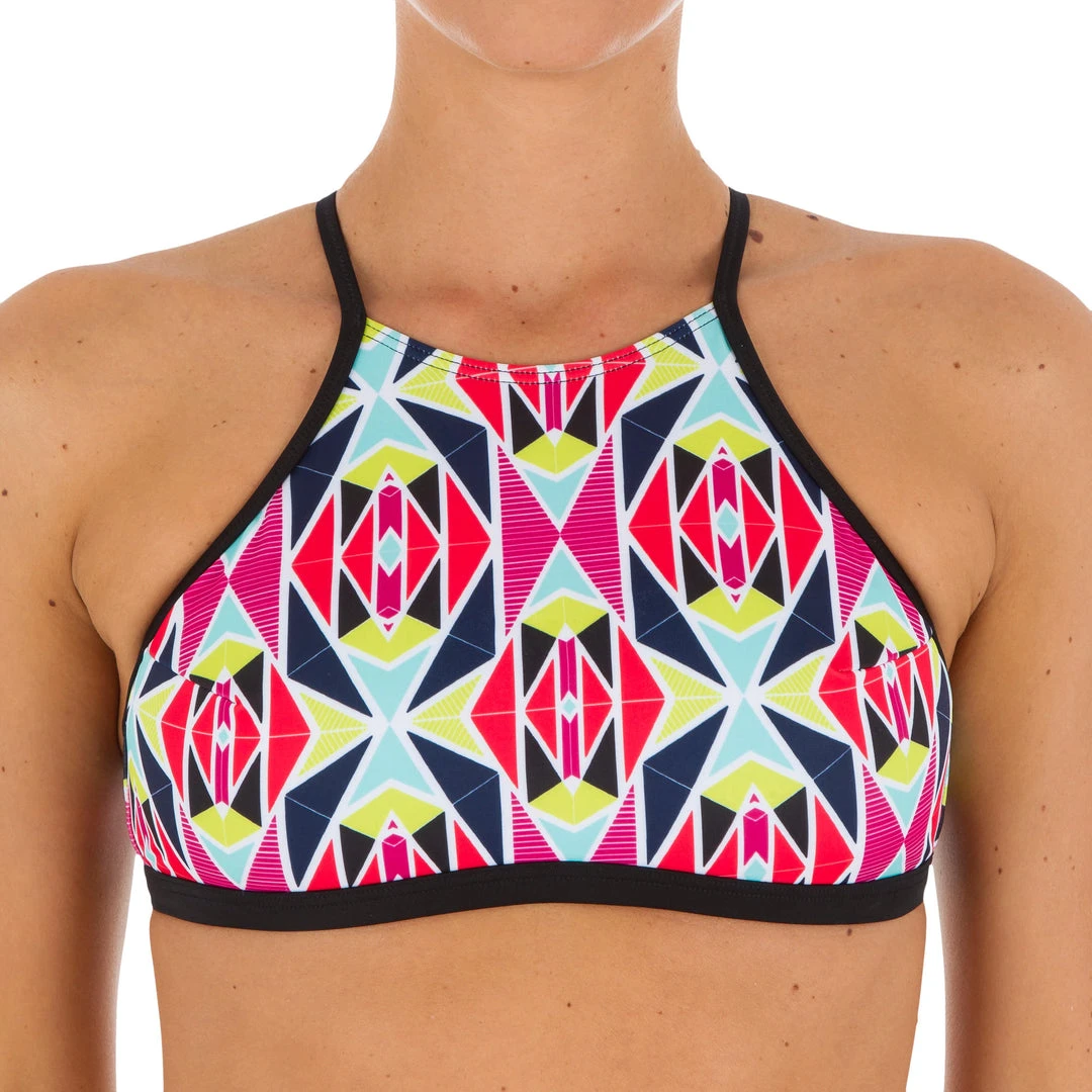 Women’s crop top swimsuit top. The chest is completely covered at the front and well supported. The shoulders and back are exposed. Adjustable crossed straps. Removable pads