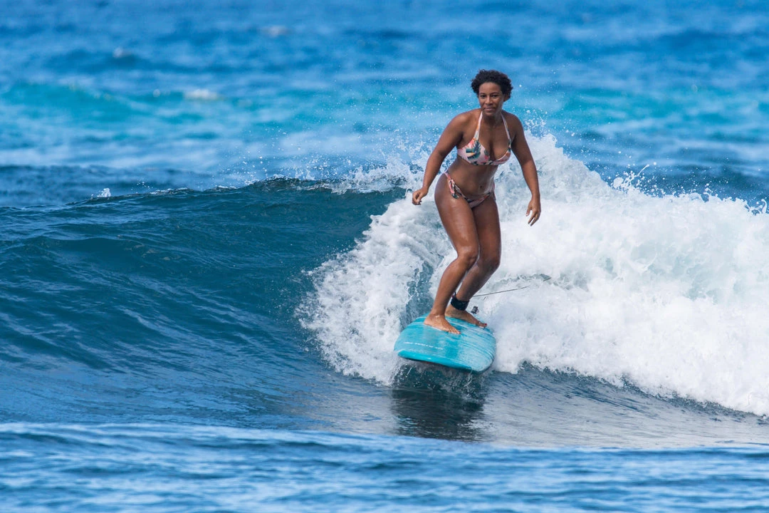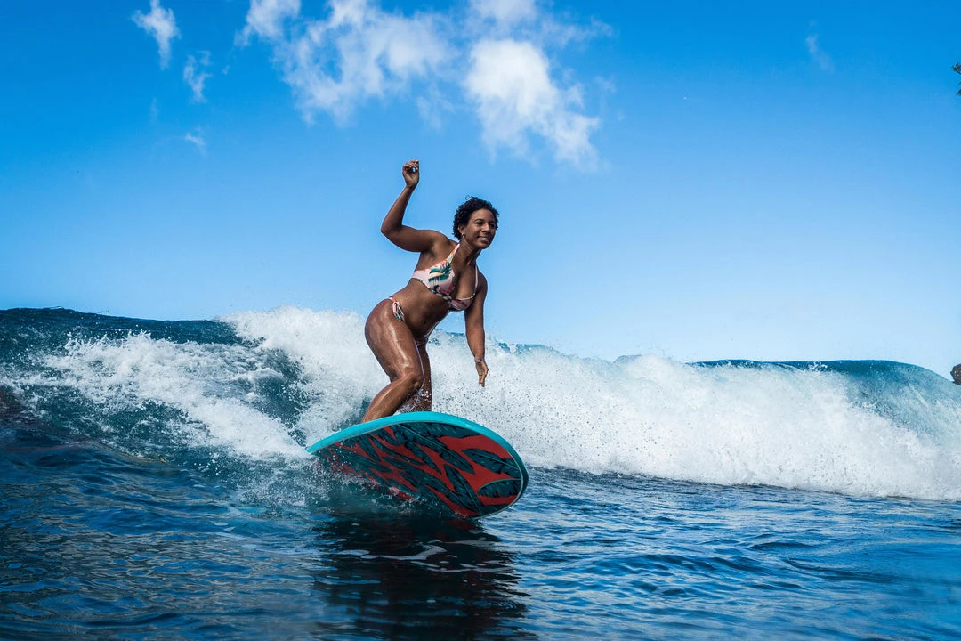 As female surfers of all levels, we have designed this swimsuit for beginner surfers surfing in broken waves.