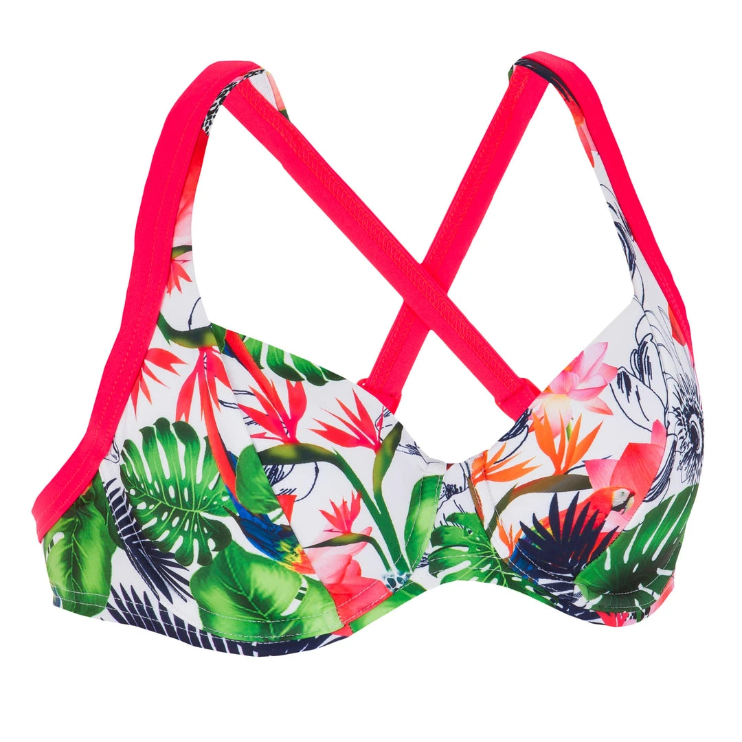 This women’s underwired balconet style swimsuit top visually minimizes the bust thanks to its body-sculpting lining. Its straps are adjustable and can be placed in a U or X shape.